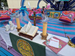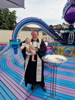 Brian Schaffrath, der Vater der Täuflingin, hatte gemeinsam mit seiner Familie und seinem Team das Fahrgeschäft in Rekordzeit aufgebaut, sodass bereits am Vortag alles bereit war. Seine Frau Lorena richtete liebevoll den Altar auf dem Podium her - mit Blumen, Kreuz und Taufkerze.