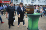 Dort angekommen, versammelten sich die Besucher um das 50-Liter-Bierfass von der Hachenburger Brauerei. Stadtbürgermeisterin Melanie Leicher übernahm die ehrenvolle Aufgabe, den Zapfhahn mit einem Schlegel in das Fass zu treiben. Sie muss heimlich geübt haben, denn es gelang ihr mit lediglich zwei Schlägen, das begehrte Nass zum Laufen zu bringen, ohne dass viel Flüssigkeit verloren ging. Dankbar nahmen sich die nach Freibier lechzenden Besucher die ersten Krüge zur Brust. Beim anschließenden Gruppenfoto waren alle Beteiligten bereits bester Laune, die sich hoffentlich über die kommenden drei Tage weiterverbreiten wird.