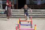 Beim Hindernislauf lag der Vorteil aufseiten sportlicher Kinder, denn die Abstände der Hürden waren unterschiedlich lang und die großen Füße der ehrgeizigen Väter "rissen" gern einmal die Schwimmnudeln über den Holzklötzchen. Altersunabhängig gab es für eine Laufzeit unter zehn Sekunden 3 Punkte. Das schafften ganz kleine Menschen nur an Paps Hand über den Parcours "fliegend". Das Überspringen des großen Hindernisses war für die erwachsenen Teilnehmer dafür obligatorisch.