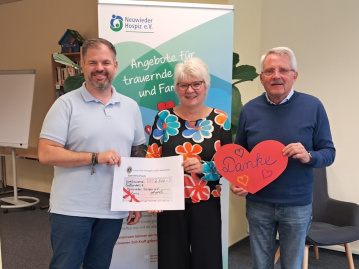"Uns ist es ein großes Anliegen, Menschen zu helfen, die in schwierigen Lebenssituationen Unterstützung brauchen, insbesondere Kindern und Jugendlichen", erklärte Rene Achten, Präsident des Lions Club Remagen-Unkel. Gemeinsam mit den Gastgebern übergab er den symbolischen Spendenscheck an Hans-Peter Knossalla, Vorsitzender des Neuwieder Hospizvereins, und Beate Christ, Kinder-, Jugend- und Familientrauerbegleiterin.