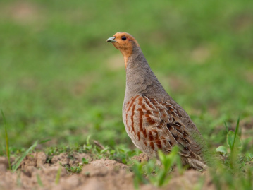 Rebhühner gehören zu den Hühnervögeln. Auf dem Rücken sind sie vorwiegend braungrau marmoriert, ihre Brust ist grau und das Gesicht orangebraun gefärbt. Die männlichen Rebhühner lassen in den frühen Morgen- oder späten Abendstunden ihren Revierruf hören, ein raues "kirräck". Das Rebhuhn brütet in dichtem Gebüsch und Hecken. Darum kann es schwierig sein, sie zu entdecken. Am besten sind sie an Feldrändern und -säumen zu beobachten, da dort die Vegetation nicht zu hoch ist.