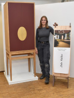 Jule Nelles aus Bad Neuenahr-Ahrweiler sicherte sich den dritten Platz im Design-Wettbewerb mit ihrem Weinschrank aus Eiche, der durch vergoldete Türbereiche hervorsticht. Ihre Arbeit zeichnet sich durch klare Linien und eine gelungene Materialkombination aus Holz und Blattgold aus.