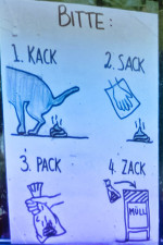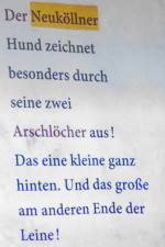 Die berühmte Berliner Schnauze wird deutlich, zum Beispiel im Aushang einer Bäckerei: „Das ist keine Touchpad-Theke. Antippen bringt nichts!“ Oft wird die Notiz von anderen kommentiert. Wie man das Maximale aus einem begrenzten Angebot herausholen kann, zeigt folgende Angebotstafel: „3-Gang-Menü: Bockwurst, Brot, Senf“. Manche Warnungen sind eigentlich überflüssig, zum Beispiel wenn unter einer sehr verdrießlich schauenden Katze steht: „Not touch the cat. It hate it!“