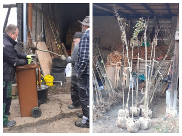 Vor der Ausgabe erhielten die Bäume einen professionellen Schnitt, um ihr Anwachsen zu unterstützen. Das ehrenamtliche Team von ANUAL sorgte dafür, dass alle Abholenden gut ausgestattet nach Hause gingen: Neben Apfel-, Birnen-, Kirsch-, Pflaumen- und Quittenbäumen erhielten sie auch Pflanzpfähle, Wühlmauskörbe und Verbissschutz - alles handgefertigt von Vereinsmitgliedern. Dies bietet den jungen Bäumen optimale Bedingungen für einen gesunden Start an ihrem neuen Standort.