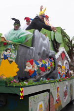 „Kleenmäschder Farbrausch“ war die zutreffende Bezeichnung für 17 Narren in einem herrlich bunten Kostüm. Rote Rosen bildeten die Vorboten für die Zwerge, die mit einem Wagen unterwegs waren auf der Suche nach Schneewittchen. Für die pastellblaue „Unterwasser“-Gruppe war das Wetter genau richtig, für die nachfolgenden Azteken eher ungewohnt. Ihr üppiger Kopfschmuck ersetzte Schirme.