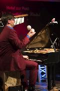 Mit Hilfe eines Buch-Spiels und durchnummerierten Klaviertasten gelang dem Musiker eine personalisierte Komposition, eine Boogie-Improvisation für das „bewegte Persönchen“ im Publikum. Mit Fußmaschine für Tanzmusik und Fill-in-Taster am Alleinunterhalter-Keyboard, gelang mit dem gesamten Publikum ein Aggressionsabbau, indem der Pianist auf ein bekanntes Volkslied nacheinander Jazz, Swing, Bill Evans Melancholie und freie Improvisation à la Keith Jarrett losließ. Das singende Publikum sang unbeirrt und freudig den Refrain weiter.