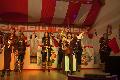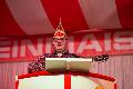 Martin Schmidt zeigte, warum er der Sitzungspräsident ist: Er kann nicht nur Beiträge ansagen, Orden und Geschenke verteilen und Küsschen einfordern, er kann auch als kalauernder Redner in der Bütt stehen, singen und dazu Gitarre spielen. Sankt Martin sang eine Eigenversion: „Ich steh hier mit meiner Laterne und meine Laterne mit mir.“ Mit seiner sonoren Stimme führte Schmidt den Schlussbeitrag des Elferrats an, ein Medley aus Karnevalsliedern, das die Ratsherren mit Georg Dills von der Partyband California eingeübt hatten. Die Band sorgte während der umfangreichen Prunksitzung für die passende Stimmungsmusik.