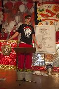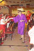 Der 14-jährige David kam als Messdiener auf die Bühne. Es war schon das dritte Jahr, dass der junge Mann in die Bütt stieg. Brauchte er bislang noch immer einen Bierkasten, damit er das Publikum sah, kam der dieses Mal ohne Erhöhung zurecht. Er berichtete, dass sich sein Chef ausgedacht hatte, Bonipunkte für den Messebesuch einzuführen. Agnes hatte 200 Punkte erreicht und die Prämie war mit ihm eine Wallfahrt nach Trier. Mit unbeschreiblicher Mimik erzählte er von der Fahrt. Aber statt Abendmahl in Trier, gab es Damenwahl in Assmannshausen. David war nämlich in Neuwied in den falschen Zug eingestiegen und dies nur, weil Agnes ihren Rosenkranz vergessen hatte und zur Bahnhofsmission ging, um sich dort einen auszuleihen. Während seinem Vortrag in gereimter Form, kam er ab und an bewusst vom Thema ab und hatte für das närrische Auditorium neueste Weisheiten. Zum Beispiel: „74 Prozent aller Kurtscheider Frauen finden ihren Arsch zu dick.“ (Lacher und Buhrufe) um dann fortzufahren: „90 Prozent würden ihn trotzdem wieder heiraten.“ Plötzlich hatten Lacher und Buhrufe eine andere Stimmlage.