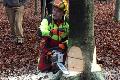 Nach der Mittagspause stand die praktische Vorführung im Wald an: Zusammen mit dem Privatwaldbetreuer Dieter Steinebach hatte Waldbesitzer Josef Lorscheid zuvor schon einige mittelstarke Buchen zur Fällung ausgesucht und markiert. Scholzen konnte an zwei Buchen den gesamten Ablauf des Fällungsvorgangs von der Hiebsicherung und Baumbeurteilung bis zur fachgerechten Fällung mit Kastenschnitt und Sicherheitsfälltechnik eindrucksvoll demonstrieren.