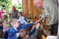Nachdem alle versteckten Tiere gefunden waren, wurde für Lucky, einen kleinen Münsterländer, eine „Wildspur“ gelegt: Ein Kind durfte einen Futterbeutel an einer langen Leine über die Wiese ziehen und am Ende der Strecke verstecken. Lucky bewies echten Spürsinn: Er nahm die Spur mithilfe seiner empfindlichen Nase auf und verfolgte die Strecke bis zum Versteck. Natürlich gab es für ihn zur Belohnung ein Leckerli. Auch die Kinder und Besucher konnten sich nochmal stärken, bevor der erlebnisreiche Nachmittag zu Ende ging.
