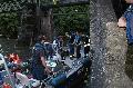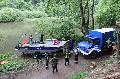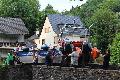 Dazu musste der mehr als fünf Meter lange Trailer mit dem Boot in Millimeterarbeit über die Steinbrücke und etwa zwei Kilometer über den Forstweg rangiert werden. Dies war nur mithilfe eines kleineren privaten Traktors und zwei Einsatzfahrzeugen auf Unimog-Basis möglich. Erst danach war es möglich, das defekte Wehr mehrfach anzufahren, um dort in Handarbeit die Bigpacks und Sandsäcke so zu versenken, dass der Wasserabfluss in ausreichendem Maße eingedämmt werden konnte.