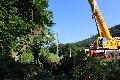 Dabei drängt die Zeit, damit der Weg wieder frei wird und der wertvolle Biotopbaum soweit möglich für das Überleben seiner seltenen Bewohner gesichert werden kann. Dafür muss der gefallene Stamm schnell in unmittelbarer Nähe auf passendem Standort in der Sonne und mit Feuchteanschluss im Boden aufrecht hingestellt werden. Würde man den Baum hinlegen, würden in kürzester Zeit Ameisen, Spitzmäuse und andere Beutegreifer eindringen, um die seltenen Arten schnell wegzufressen. Die „Stehendlagerung“ ist die einzige Methode, Biotopbäume mit wertvoller Fracht noch einige Jahre zu erhalten. Sie ist im Naturschutz mittlerweile gängige Praxis. Mit einem Spezialkran wurde der 4,7 Tonnen schwere Torso mit dem wertvollen Inhalt von circa 1,5 Kubikmeter Holzmoder aufgerichtet und an seinem neuen Standort sicher befestigt.