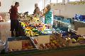 Den größten Stand hat der Obst- und Gemüsehändler, der auf der Rückseite in der Mehrzweckhalle seine Waren feilbietet. Früh morgens war er auf dem Großmarkt und hat eingekauft. Er kommt schon seit Anfang an. „Dem seinen Salat kann man locker einer Woche im Kühlschrank aufbewahren, ohne das er welk wird“, berichtet eine Käuferin und ergänzt: „Er hat nur frische Sachen.“