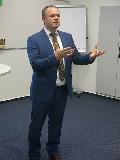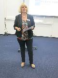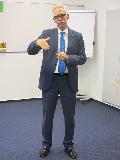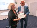 Zuletzt sprach die Geschäftsführerin der IHK-Akademie, Dr. Sabine Dyas, zu den Gästen. Auch sie konnte ihren sichtbaren Stolz über das Erreichte nicht verhehlen, berichtete davon, dass es auch häufig bei Besprechungen ziemlich laut geworden sei. Letztendlich habe aber das gemeinsame Ziel alle Hindernisse aus dem Weg geräumt und über allem gestanden. Sie sagte, dass ohne das gesamte Team dieser Erfolg kaum machbar gewesen sei, dabei hob sie explizit nochmals Torsten Scherr hervor, ebenso den Architekten Wolfgang Rumpf für dessen Planung und Bauleitung. Denn während der vierjährigen Umbaumaßnahmen wurde der Ausbildungsbetrieb fortgeführt, eine logistische Meisterleistung. Zum Ende des offiziellen Teils überreichte der Architekt Rumpf Dr. Sabine Dyas symbolisch einen überdimensionierten Schlüssel zur Einweihung, damit ist sie auch offiziell die Hausherrin.