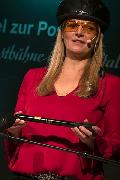 Da ihre Kinder Fußball spielen, machte Ruscher sich Gedanken um die Fifa und die Weltmeisterschaft in Qatar sowie die Hooligans am Spielfeldrand bei Kinder- und Jugendmannschaften, die Eltern. Wie Thermomix-Thekla, Rambo-Attila-dem-sein-Vater und andere ehrgeizige Helikopter-Eltern dem behüteten Nachwuchs und dem ahnungslosen Schiedsrichter die Regeln des Nahkampfs beibringen, gab die Kabarettistin in einem Radio-Live-Bericht anschaulich wieder.
