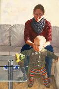 Bei großformatigen abstrakten Acrylwerken mit breiten Pinselstrichen und starken Farben, die zunächst durchzogen und verwischt und danach ordnend bearbeitet wurden, um Raum für die Figuren zu schaffen, oft aus dem Themenbereich Atelier, Maler und Modell, verschränken sich beim Näherkommen Figur und Raum. Farbdominanz herrscht in vielen Bildern. Die Farbe Gelb steht für Licht.