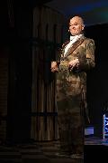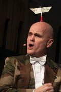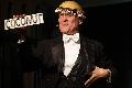 Nach dem intellektuell anspruchsvollen Vortrag Schnoys setzte der Ganzkörpertrommler und Rhythmusknacker Andi Steil, der bereits beim ersten Kabarett a la surprise in Waldbreitbach dabei war, einen skurrilen Kontrapunkt: Im „unauffälligen“ Frack mit Tarnfleckmuster passend zur Designer-Frisur, demonstrierte er Trommeln auf dem Mund und Flamenco-Klatschen. Ein leeres Sliwowitz-Fläschchen als Instrument, kombiniert mit sonorem Gesang, Vogelgezwitscher und eckigen Bewegungen ergaben einen irrwitzigen Auftritt.