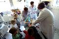 „Uns war es wichtig, Ängste bei den Kindern abzubauen und ihnen zu zeigen, dass Ärzte nicht böse sind“, erklärt Rebecca Eul, Assistenzärztin der Chirurgie im DRK Krankenhaus. Da lag die Idee nahe, den Kleinen nicht nur theoretisch von Krankenhausuntersuchungen zu erzählen, sondern sie ganz praktisch aus erster Hand miterleben zu lassen, was in den Untersuchungszimmern mit all den geheimnisvollen Apparaten passiert: Wie sieht ein Roentgen-Bild aus? Warum muss man gebrochene Arme eingipsen? Wie fühlt man den Puls und wie setzt man ein Stethoskop richtig auf? Das fachgerechte Abhorchen konnten die Knirpse natürlich selber ausprobieren und einen geduldigen Teddybär buchstäblich auf Herz und Nieren prüfen. Und wer wollte, konnte sich auch einen echten Gipsarm machen lassen und so stolz ein kleines Andenken an die Stippvisite im Krankenhaus nachhause tragen.