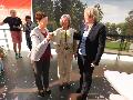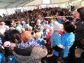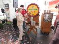 Roswitha Schulte betrat anschließend die Bühne, um den Fassbieranstich zu vollziehen. Da sie eine äußerst zierlich Person ist, bat sie den kräftigen Kreisbeigeordneten Michael Mahlert um Unterstützung, falls es ihr nicht gelingen sollte, den Zapfhahn mit dem Schlegel in das Fass zu treiben. Roswitha Schulte hatte wohl ihre Kräfte unterschätzt, denn unter dem Jubel der Gäste gelang es ihr, mit nur drei Schlägen den Zapfhahn zu versenken, ohne dass es eine Bierdusche gab. Die ersten drei Biere aus dem Fass in zünftigen Krügen stemmten dann die Damen Roswitha Schulte, Birgit Haas und Barbara Mertgen. Während das Freibier an die Gäste verteilt wurde, wurden sie weiter von Bruce Kapusta unterhalten.