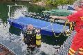 Kurz nach dem Eintreffen an der Einsatzstelle stellten die Einsatzkräfte fest, dass die Autobatterie in rund fünf Metern Tiefe lag und durch die Feuerwehr nicht geborgen werden konnte, in Neuwied gibt es keine Feuerwehrtaucher. So entschied sich der stellvertretende Wehrleiter, Florian Bauer, die DLRG mit einem Taucher zu alarmieren, um die Bergung vornehmen lassen zu können.
