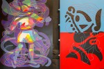 Die großformatigen leuchtenden Gemälde, die Konstantin Voit mit Schablonen gestaltet hat, welche er am PC bearbeitete, kommen auf der schwarzen Wand großartig zur Geltung.