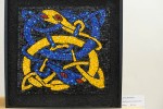 Günter Krummeich ist wieder mit Keramik vertreten, die teilweise beleuchtbar ist. Sein „Kopf mit Perücke und Zopf“ kommt ganz aktuell mit Kopfhörer und Mund-Nasen-Schutz daher. Der zweite Günter, Günter Bruchof setzt mit vielfältigen kleinen und ganz kleinen Steinchen Mosaike zusammen. Die Portraits und großen Landschaftsgemälde Sezai Danis nehmen vor dem Diana-Saal viel Raum ein. Sternzeichen in großen und ganz kleinen Formaten sind auf und um den Flügel gestellt, es handelt sich um Gouachen von Ilse Christiansen-Kappus.