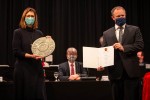Zu Beginn der letzten Stadtratssitzung im Jahr 2020 nutzte Neuwieds Stadtoberhaupt Einig die Gelegenheit, um Regine Wilke, Fraktion Bündnis 90/Die Grünen, für ihre 20-jährige Tätigkeit im Neuwieder Stadtrat mit dem Ehrenteller der Stadt Neuwied, verbunden mit dem Eintrag ins goldene Buch der Stadt, auszuzeichnen. „Mit der Verleihung machen wir deutlich, dass sich die Stadt ihnen gegenüber zu Dank verpflichtet sieht“, sagte Oberbürgermeister Einig in seiner kurzen Laudatio.