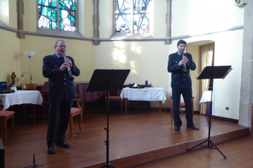 Im Rahmen des zweiten Konzertes, das zwei Mitglieder des Ensembles mit ihren Klarinetten bestritten, wurden Stücke wie zum Beispiel die Zauberflöte von Mozart, der Schneewalzer aber auch alte bekannte Schlager von Peter Alexander und Cornelia Froebess zum Besten gegeben. Den Abschluss bildete der Radetzkymarsch.