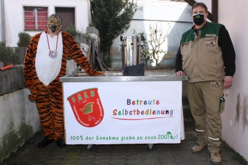 Die spontan gegründete Fassenachtsgesellschaft 1825,7 Engelsbesch (FGEB) machte sich am Fassenachtsdienstag auf den Weg durch das Dorf und sammelte Spenden für den Zoo Neuwied. Tiger, Giraffe und Einhorn hatten mit der speziell gebauten Theke die Sympathien der Schaulustigen schnell auf ihrer Seite und für die Spende gab es als Dankeschön etwas Süßes. Der Vorsitzende der FGEB konnte Zoodirektor Mirko Thiel schließlich rund 380 Euro an Spenden für die Arbeit des Zoos Neuwied überreichen.