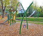 Die Stahlkonstruktionen mit Netzlandschaft und Nestschaukel erinnert eher an bespielbare Kunst als an Spielplatzgeräte und selbst der Sandkasten wurde mit einer futuristisch anmutenden Spielanlage ausgestattet. Großzügige Sitzmöglichkeiten aus Stein und Holz laden zum Verweilen ein. Im Sommer spenden Bäume ersehnten Schatten, und ein befestigtes Wegenetz unterstreicht den inklusiven Gedanken.“